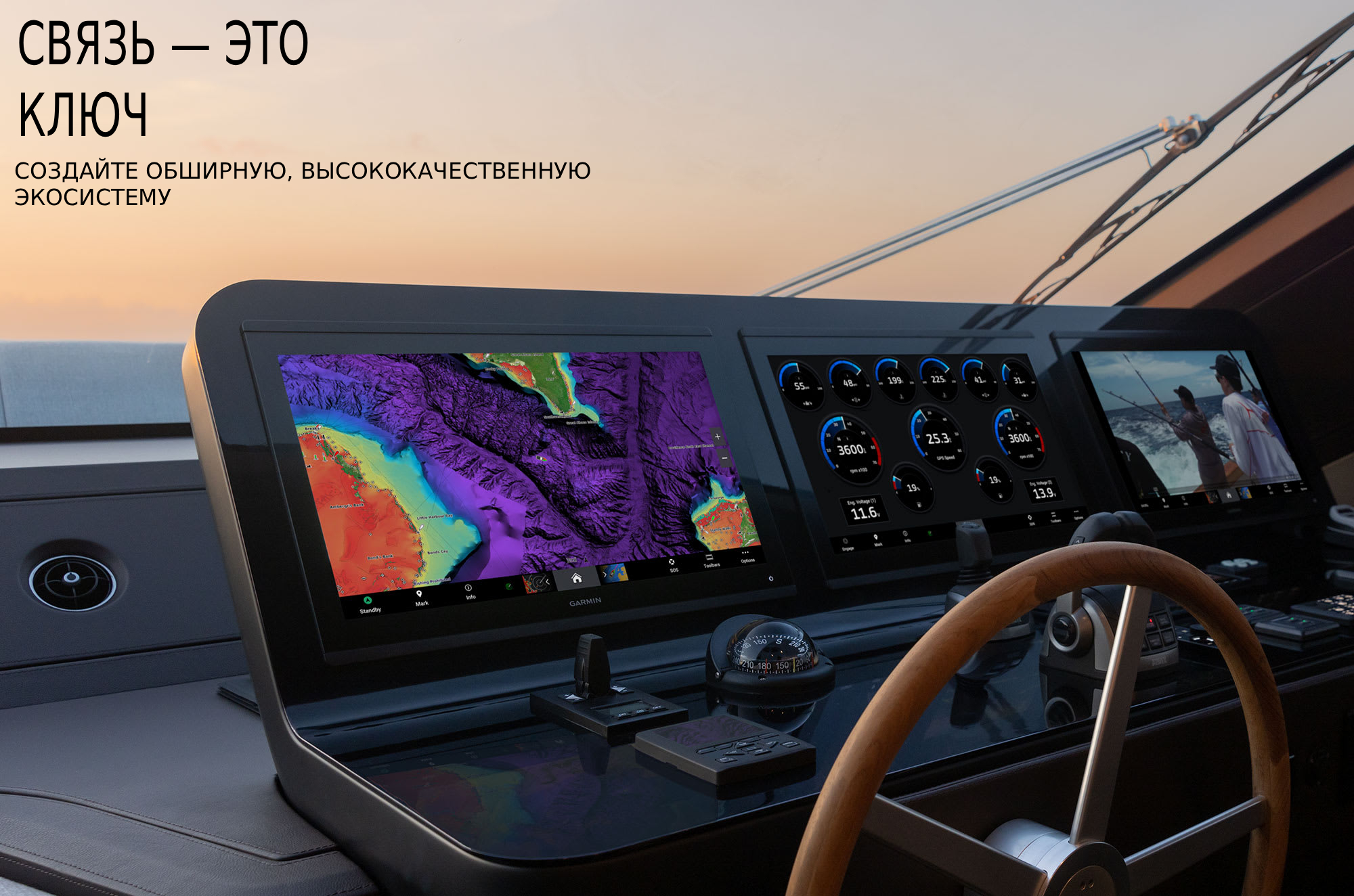 Это первый в отрасли интегрированный картплоттер с сенсорным экраном 4K. Наслаждайтесь чёткостью изображения по всему экрану и роскошью на стеклянном штурвале с превосходным дизайном и материалами, а также улучшенными возможностями подключения и скоростью.