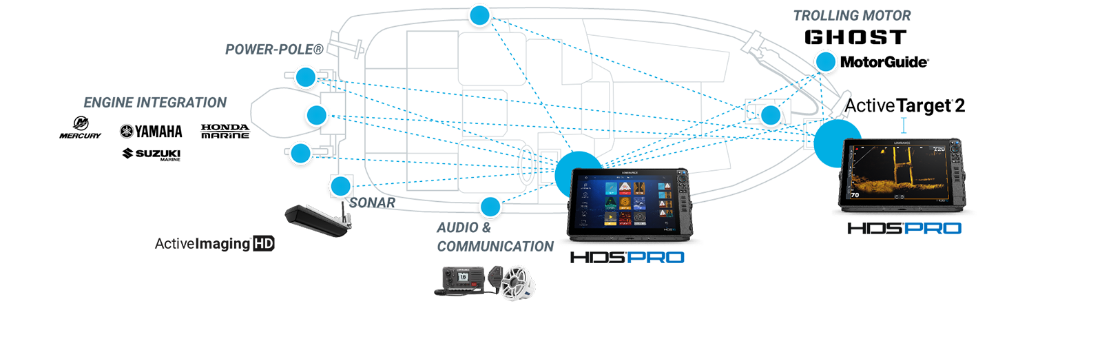 HDS® PRO поддерживает весь спектр передовых технологий поиска рыбы — от ActiveTarget® 2 Live Sonar и Active Imaging™ HD до сенсорного управления троллинговыми моторами Ghost® и RECON™.